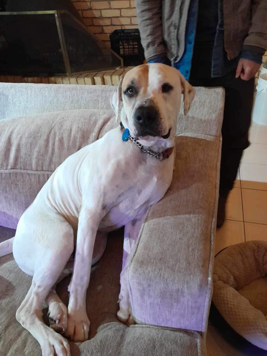 Dogs: A very friendly pup who can sometimes become overexcited, he responds well to commands like "move away" but thrives best with a caregiver experienced in handling larger breeds.