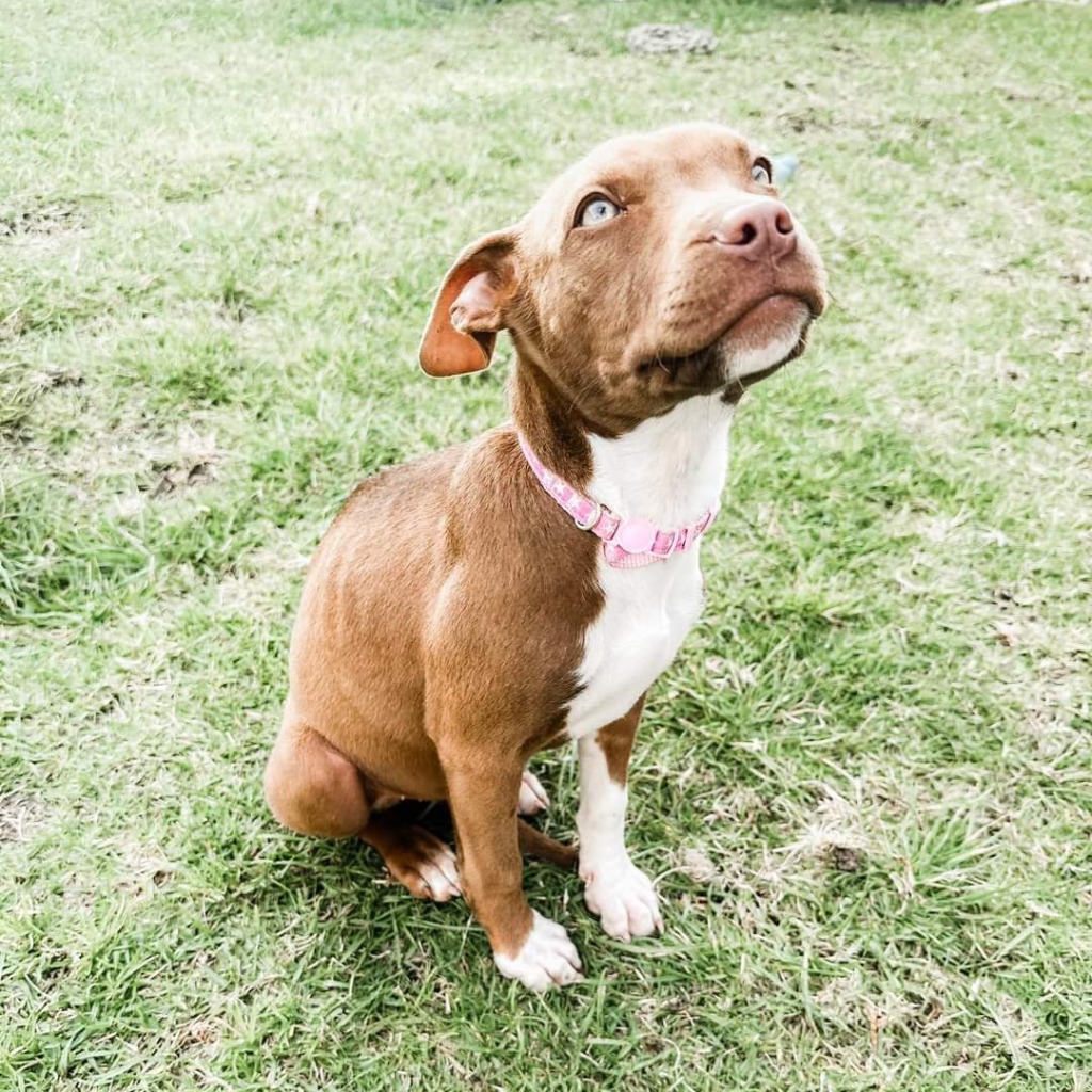 She's enjoying some light training and plays nicely running around the backyard with a (much) bigger dog and young kids.