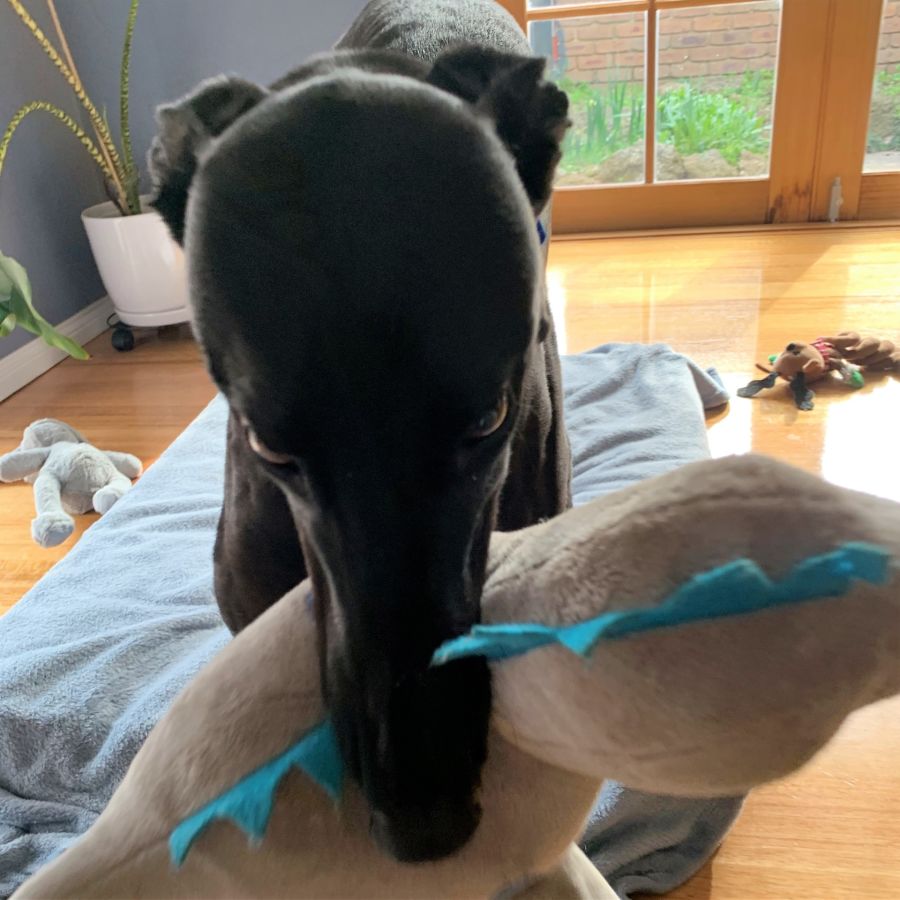 She has the odd playful, puppy moment jumping up and down throwing her teddies but other than that acts quite mature for a 4-year-old greyhound and like a true greyhound she enjoys spending most of her time at home snoozing in the sun where possible.