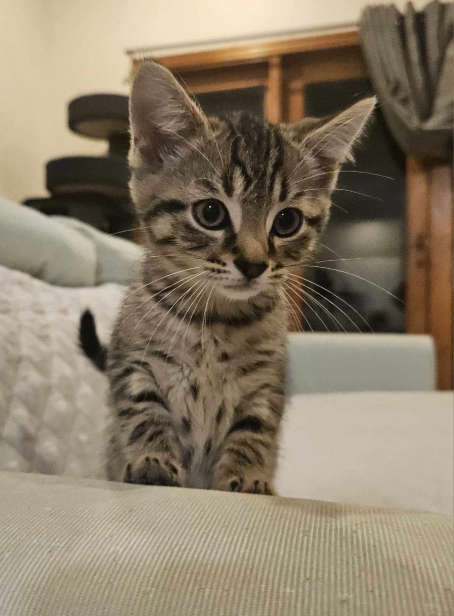 Meet the delightful Snickers, a sweet and spirited female kitten with a personality as irresistible as her namesake chocolate bar! Snickers has a knack for capturing hearts and stealing the spotlight. Her full-time job? Seeking your attention, and boy, is she excellent at it! Picture her as your loyal purr-sonal shadow, always by your side to ensure you're never lonely. While she may be just a tad clingy, it's because she thrives on being close to her beloved humans. You never know when a cuddle emergency might strike, and Snickers is more than ready to answer the call.