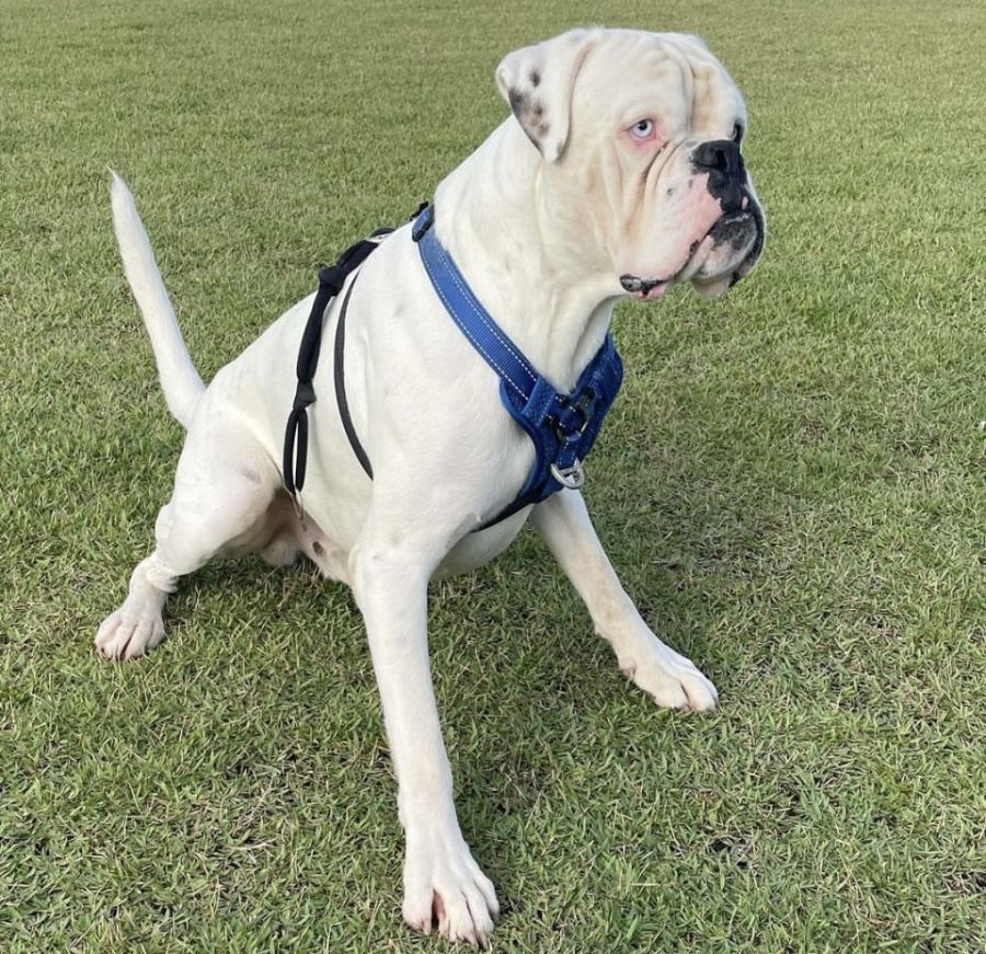 Kumo is a gentle boy with a warm, loving nature. He is great with children, though he is best suited for kids aged 10 and up due to his bouncy boxer nature. He walks well on a leash, especially with a harness and he gets along with other dogs.