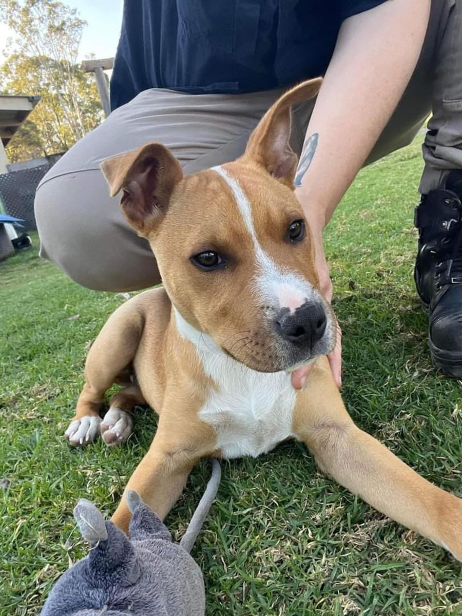 Super cute, loving boy, I think heโs nearer to 3 to 4 months old. He is a Staffy x. Loves other dogs, kids and people. Wonโt be a big boy, more medium size and will learn his manners quickly as very smart.