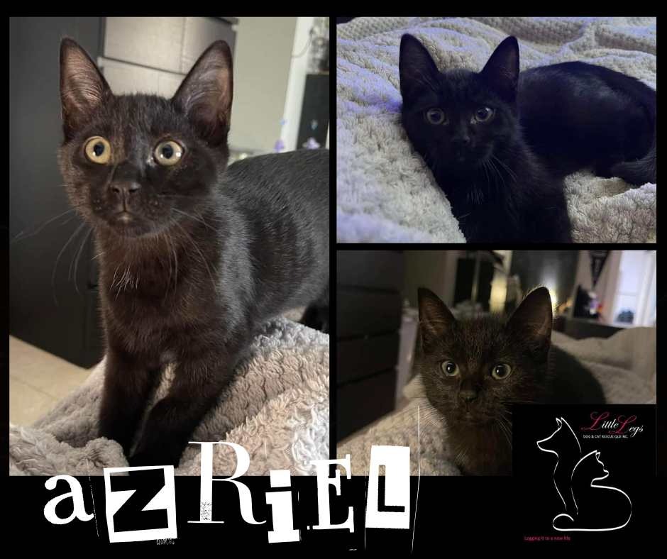 Hello there!! My name is Azriel and I'm searching for my forever family. Could it be with you? I'm a sweet little fuzz ball who would love nothing than to cuddle up with you on the couch or in bed and purr up a storm. I really do love affection, and you will see how much with my instant purring. I will follow you around the house to see what you're doing... cause I'm a very curious little guy, there's still so much about this big world I'm learning about. I enjoy playing with my foster friends and my brother, and boy oh boy do I love playing with the kitty toys. There's this thing in my foster home that I'm told is a dog... I'm not too sure about her yet, she's soooo big compared to me, but I'm sure as I get bigger, she won't be so scary anymore. I'm a great little eater. I love my bikkies, but I love my wet food even more. I'm also a pro at using the litter trays. If you think that you could provide me the life I deserve, then please fill out the application form to come and meet me. I can't wait to see you