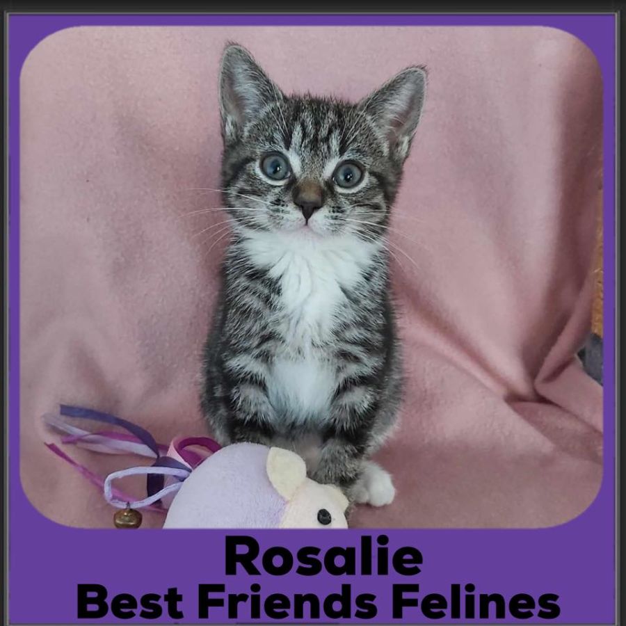 Hi my name is Rosalie and I'm just the sweetest cutest tabby kitten. I'm quite a petite kitty but don't let that fool you, as during playtime I'm a mini pocket rocket.