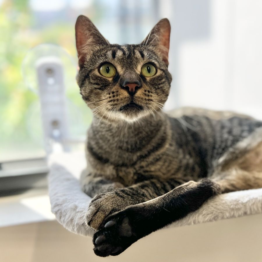 He’d be best in a home with no young children, as he can be quite rough, particularly when he wants to play. A home with someone familiar with cat body language would be best.