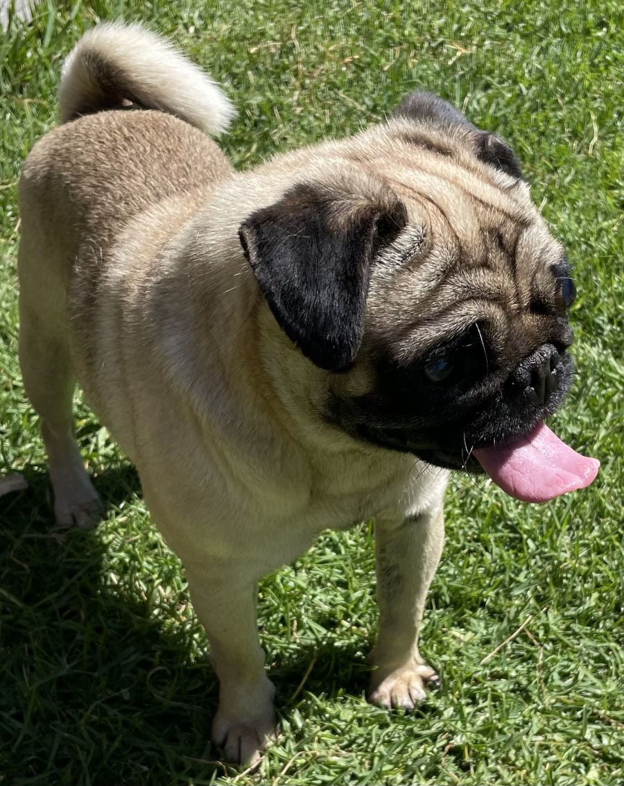 Pugsley is an extremely happy dog who comes when he’s called and is always happy to greet you. He loves playing with his toys and he definitely loves his dinner