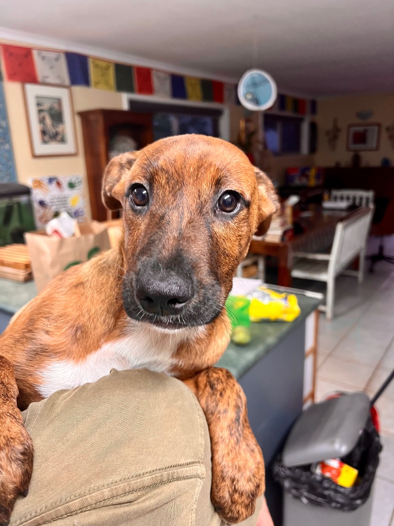 KEVVIE! Little Kevin is all sass, and who wouldn't be with 3 sisters! He and his siblings came in quite unwell and full of worms, but they've absolutely thrived in care, making friends the resident chickens, dogs and cats! Now that they're safe and loved, Kevin is ready to fly the coop and find a family of his own.. he's very thoughtful and reflective. Will sit on command. Seems to be looking right into your eyes at times we often wonder what he's thinking . Pretty sure it's love ! He's a smart little man and has some unusual colourings . Would make a good dog for someone who wants to take him out and about with them . Just because he's smart and will make a good companion for you . It's his manners and his gentleness I think