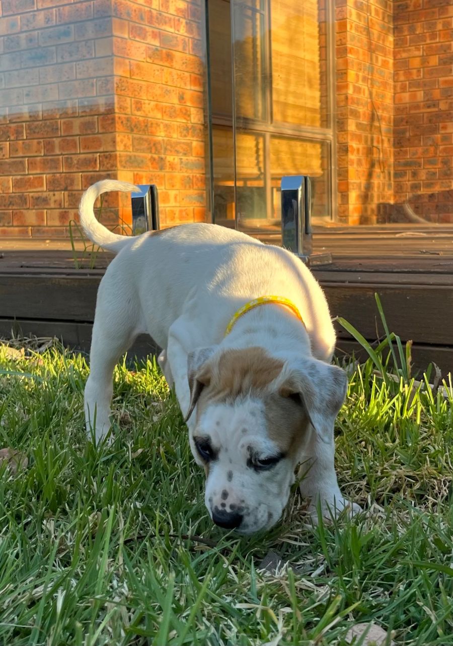 Fudge loves being around people and always wants to be picked up and held. He is one of the biggest in the litter and is also one of two puppies that are always willing to tug at your pants leg for attention! He enjoys playing with his brothers and sisters in games of rumbling or tug-a-war, but he also loves snuggling with older dogs and spending time with you. Fudge is very well socialised to both dogs and people but has not been tested with cats yet. He also isn't phased by chickens that live near his yard.