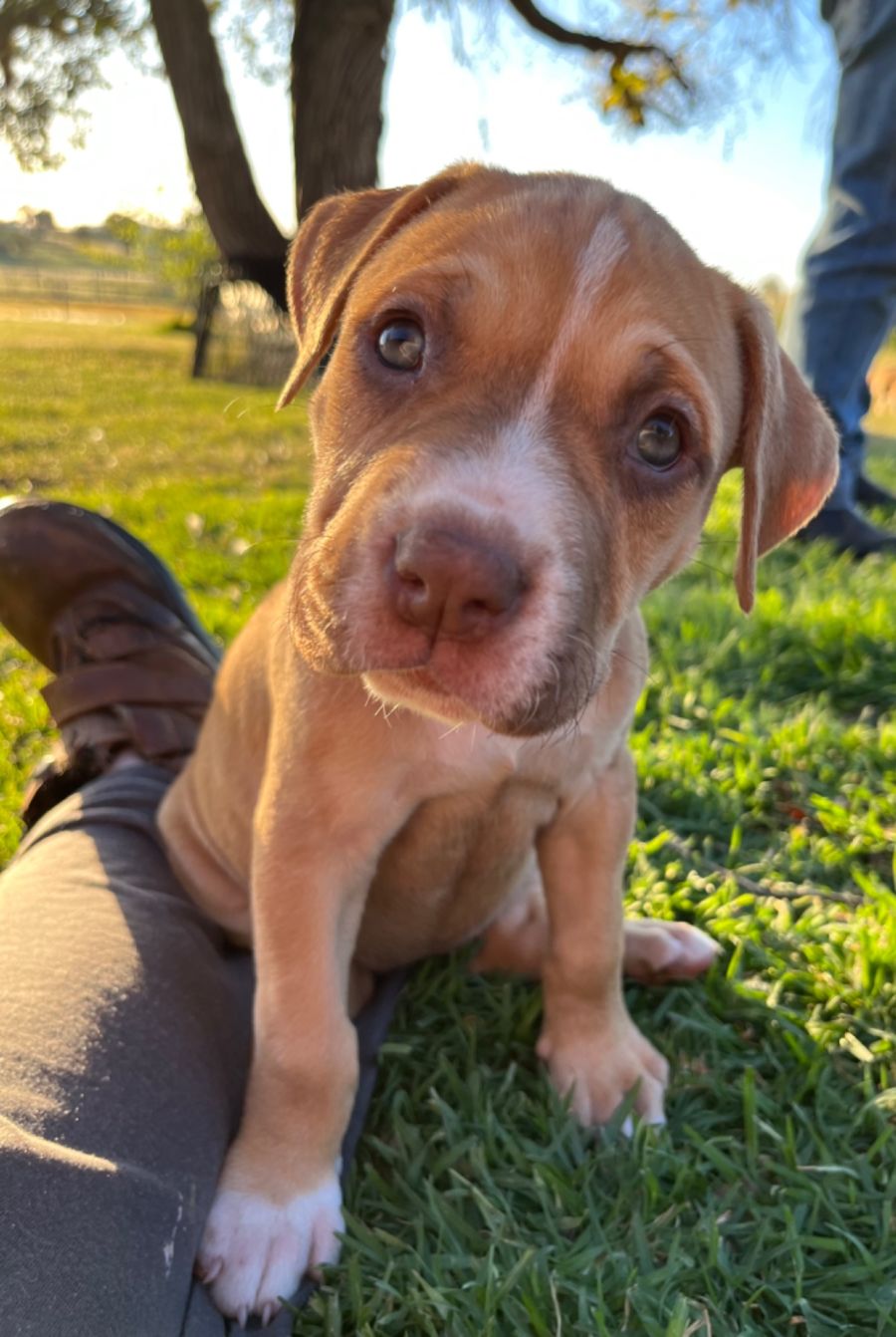 Daisy is a beautiful tan and white pup that loves to play with her brothers and sisters. She was one of ten puppies born in care to Tilly, who was found wandering without an owner. Daisy has a great attitude towards people, and loves to be picked up and cuddled. She is very socialized to both dogs and people, though she hasn't been tested with cats or chickens yet. Daisy enjoys the company of the older dogs and will snuggle or play with them often. Her favorite games are rumbling, tug-a-war, and following the big dogs around. If you're looking for an energetic pup that loves cuddles and attention, Daisy is your girl!