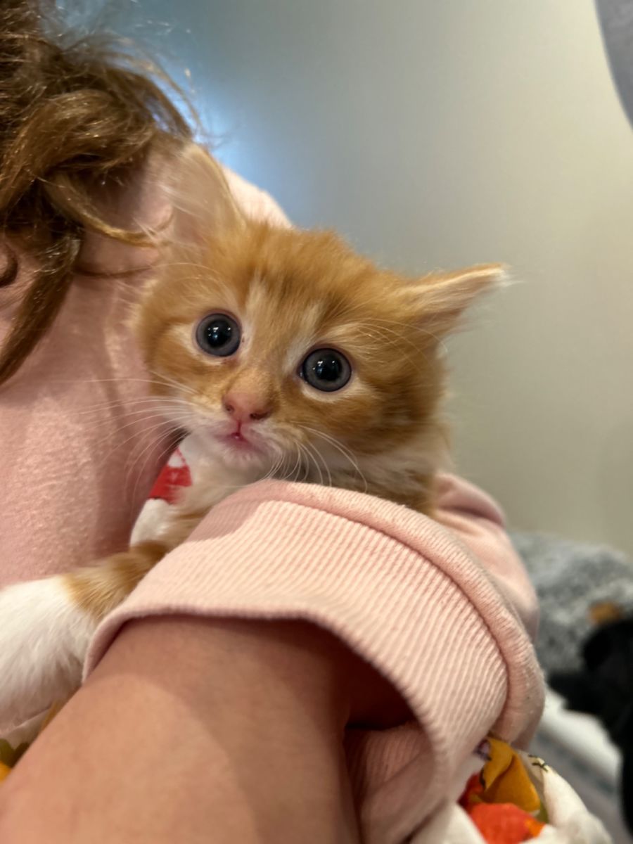 Orangello is a fluffy orange boy and Jellytot is a white and tabby boy.