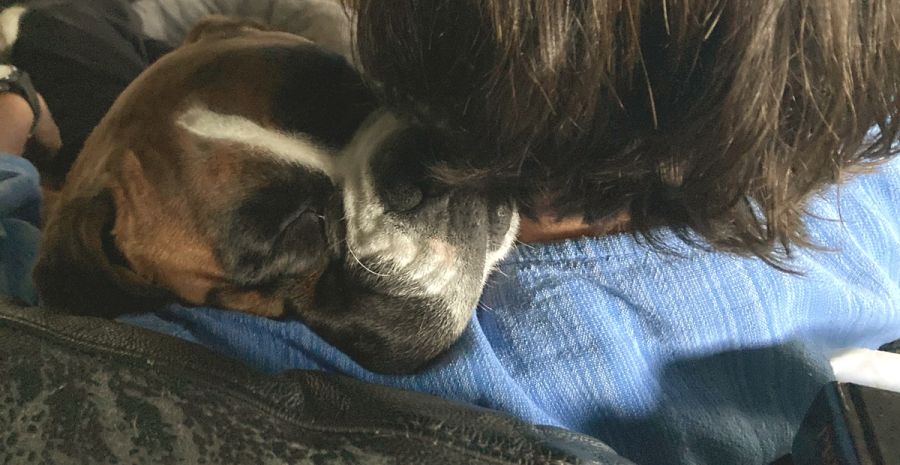 She is happy to snuggle up on the lounge for a nap with her person.